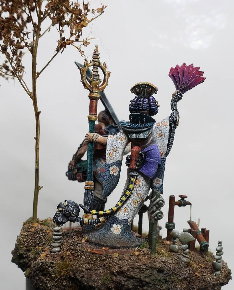 Very good question! I did read a bit into the lore and was very concerned with creating something that is true to the underhive setting. I really wanted to balance the beauty of a japanese garden with the gunk of Necromunda. On that note, the model with the white robe is actually barefoot and it really made my fantasy go wild: How could such a place in the Necromunda universe look like, where you can walk barefoot? In the end I came up with this decaying run-down techno-japanese garden. Also I wanted to stay true to the GW IP and respect the japanese culture as a whole and avoid clichés, so there was a lot to balance there.