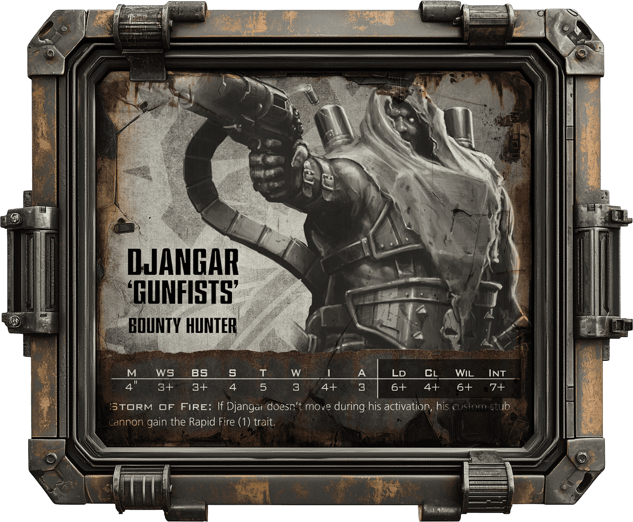 Djangar Gunfists' bounty hunters wield modified Stub Cannons that, likely thanks to the ammo belts shown in the illustration or a custom reloading mechanism, can continuously feed rounds into the weapon — allowing them to unleash a hail of bullets (→ Storm of Fire).